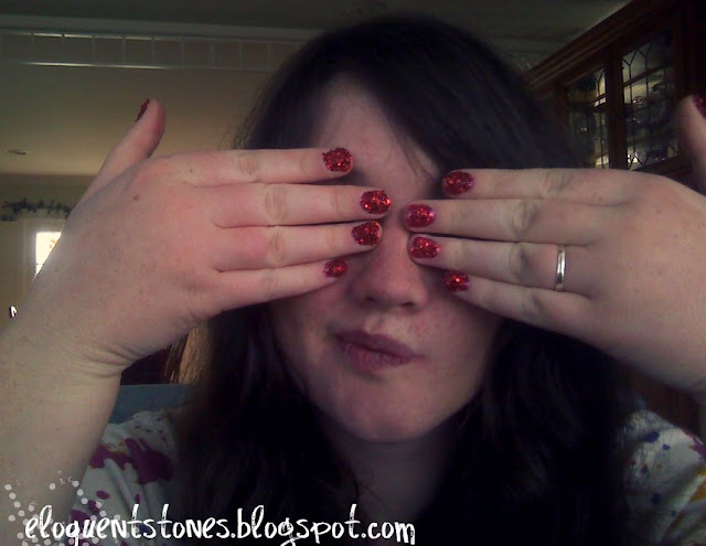 The best part of this mani is that there are only two quick steps! First liberally paint one nail at a time then immediately delicately dip each nail into the lose glitter. Repeat 9 more times wait about 10 minuets and then presto change-o! You will be a real life glampyre!